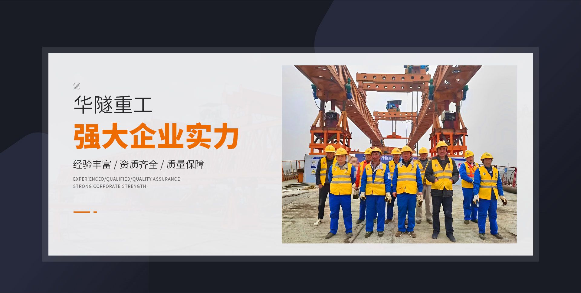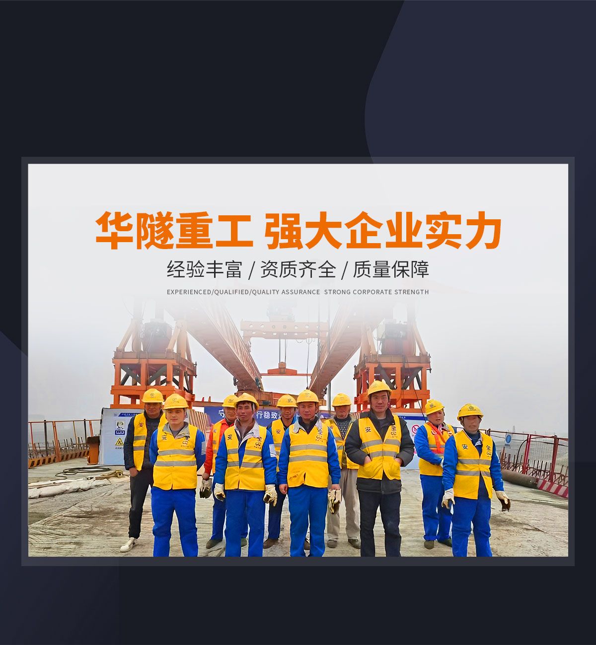 河南華隧重工機(jī)械裝備有限公司主要從事通用門式起重機(jī)、橋式起重機(jī)、電動(dòng)單梁起重機(jī),輪胎式起重機(jī)、架橋機(jī)、提梁機(jī)、遠(yuǎn)梁平車、鋼絲繩電動(dòng)萌蘆、卷揚(yáng)機(jī)、起重配件制造、銷售:起重機(jī)械租賃、安裝和維修,起重設(shè)備園收,機(jī)械設(shè)備維修,鋼結(jié)構(gòu)工程承包,橋梁工程及技術(shù)咨淘服務(wù),銷售五金制品、機(jī)電設(shè)備:建設(shè)工程監(jiān)理,建設(shè)工程設(shè)計(jì),各類工程建設(shè)活動(dòng),建筑勞務(wù)分包,建筑物折除作業(yè),施工作業(yè),工程管理服務(wù),土石方工程施工,裝如發(fā)運(yùn)。  公司已通過IS0國際質(zhì)量、環(huán)境、健康與安全三合一標(biāo)準(zhǔn)認(rèn)證,特種設(shè)備制造許可證和特種設(shè)備安裝改造維修許可證。擁有完熟的質(zhì)量管理體系。嚴(yán)格的管理制度,強(qiáng)大的生產(chǎn)能力和先進(jìn)的檢測手段,在保證產(chǎn)品質(zhì)量的同時(shí),也具備了極強(qiáng)的市場競爭力。  公司堅(jiān)持科技創(chuàng)新為理念,產(chǎn)品質(zhì)量為核心,注重信譽(yù),建立了減信可靠、快捷、思速。便利周到的售后服務(wù)網(wǎng)絡(luò)。  我們擁有的技術(shù)專家和技術(shù)服務(wù)隊(duì)伍為客戶提供充善的售前技術(shù)支持和全天候的售后服務(wù)體系,讓您無后顧之憂,享受一站式的超值服務(wù)。  “華隧重工,伴您成功“是華隧重工永遠(yuǎn)的宗指,真被的希望與各界朋友攜手并進(jìn)。共創(chuàng)輝準(zhǔn)!